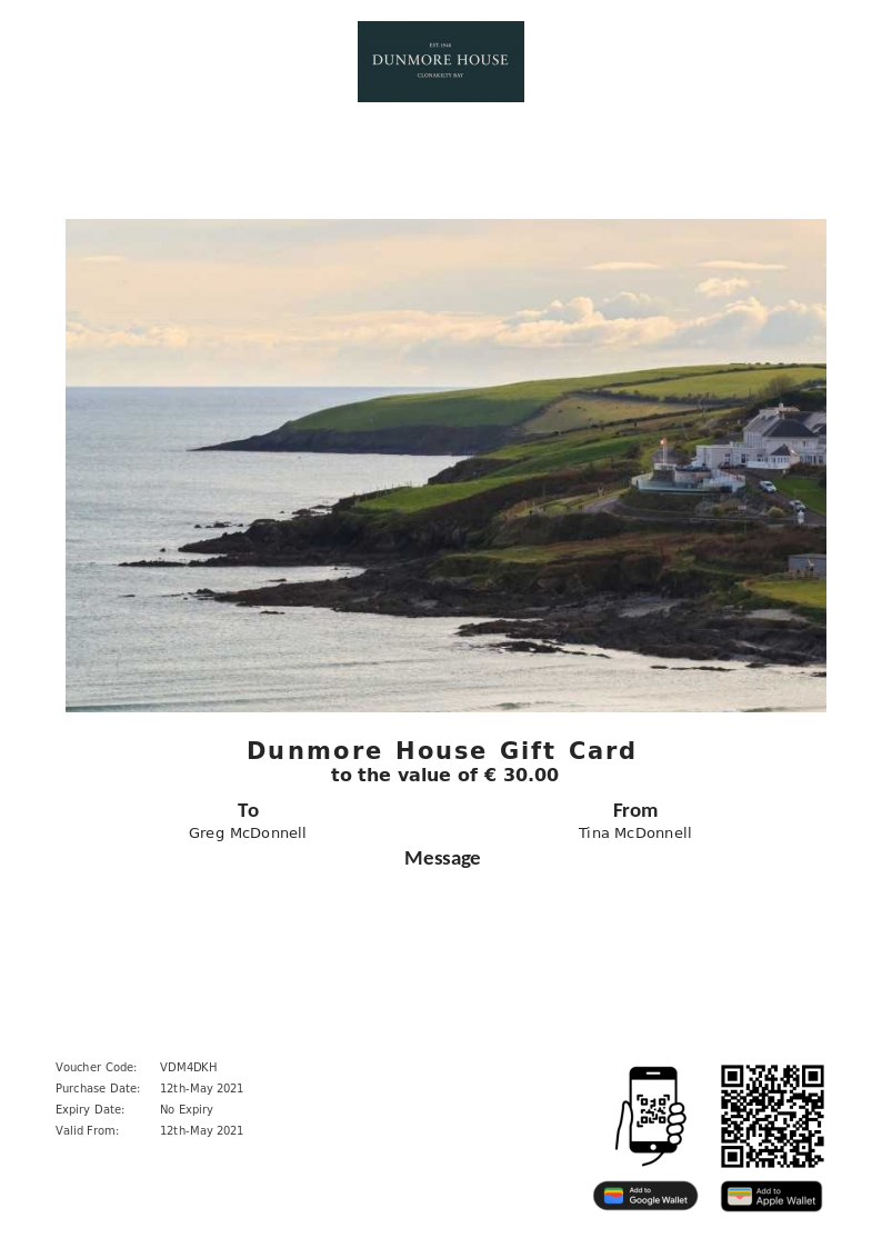 Dunmore House allows you to purchase instantly printable gift vouchers, special offers and tickets using the Voucher Connect platform.